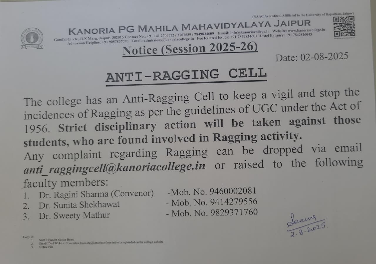 Kanoria PG Mahila Mahavidyalaya has an Anti ragging cell to keep a vigil and stop the incidences of Ragging, if any, happening / reported in college campus. Anti-Ragging Committee will always be involved in designing strategies and action plan for curbing the Menace of Ragging in the college by adopting array of activities, whenever required. The identity of the complainant will not be disclosed & Secrecy will be strictly maintained.