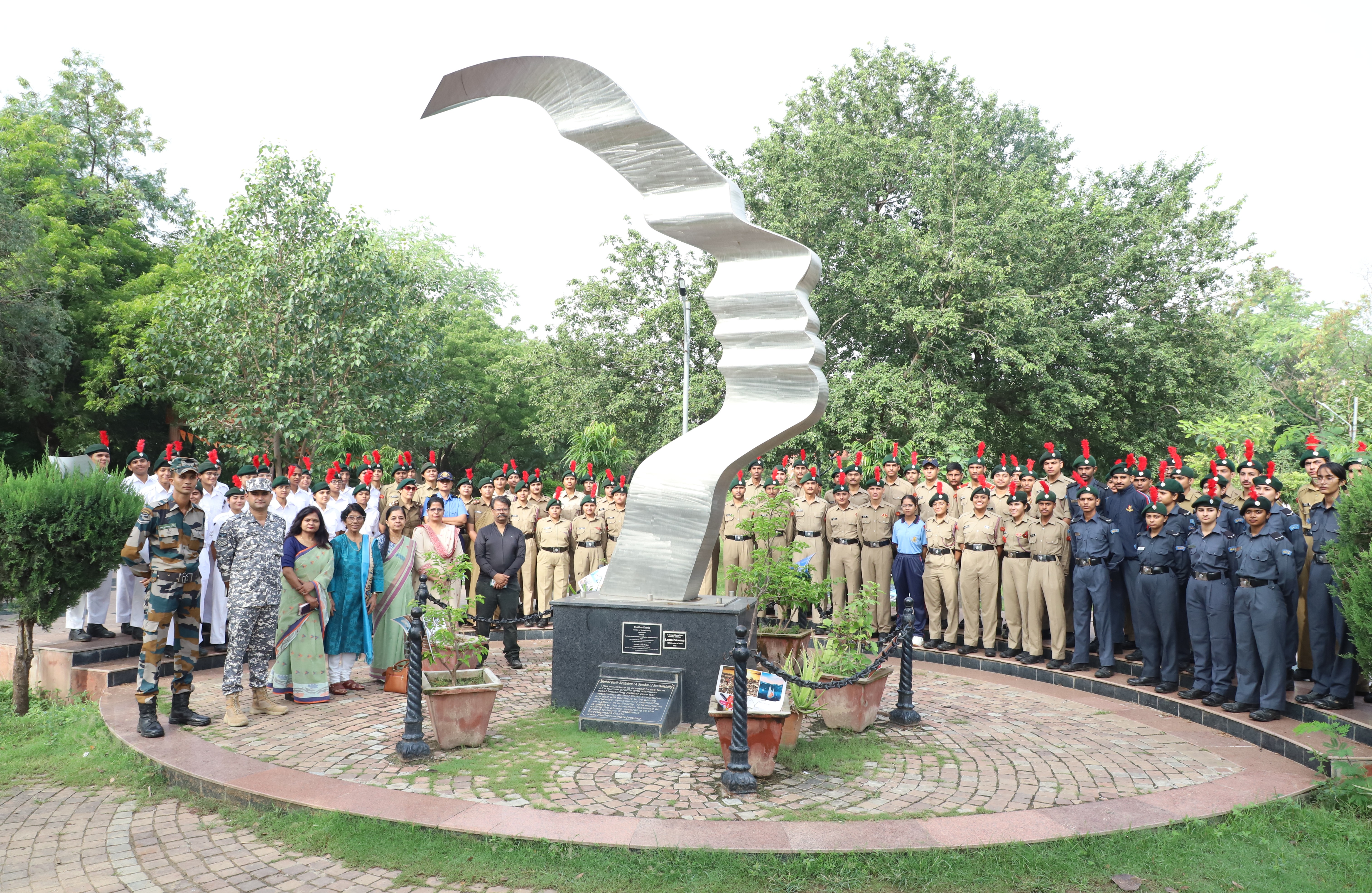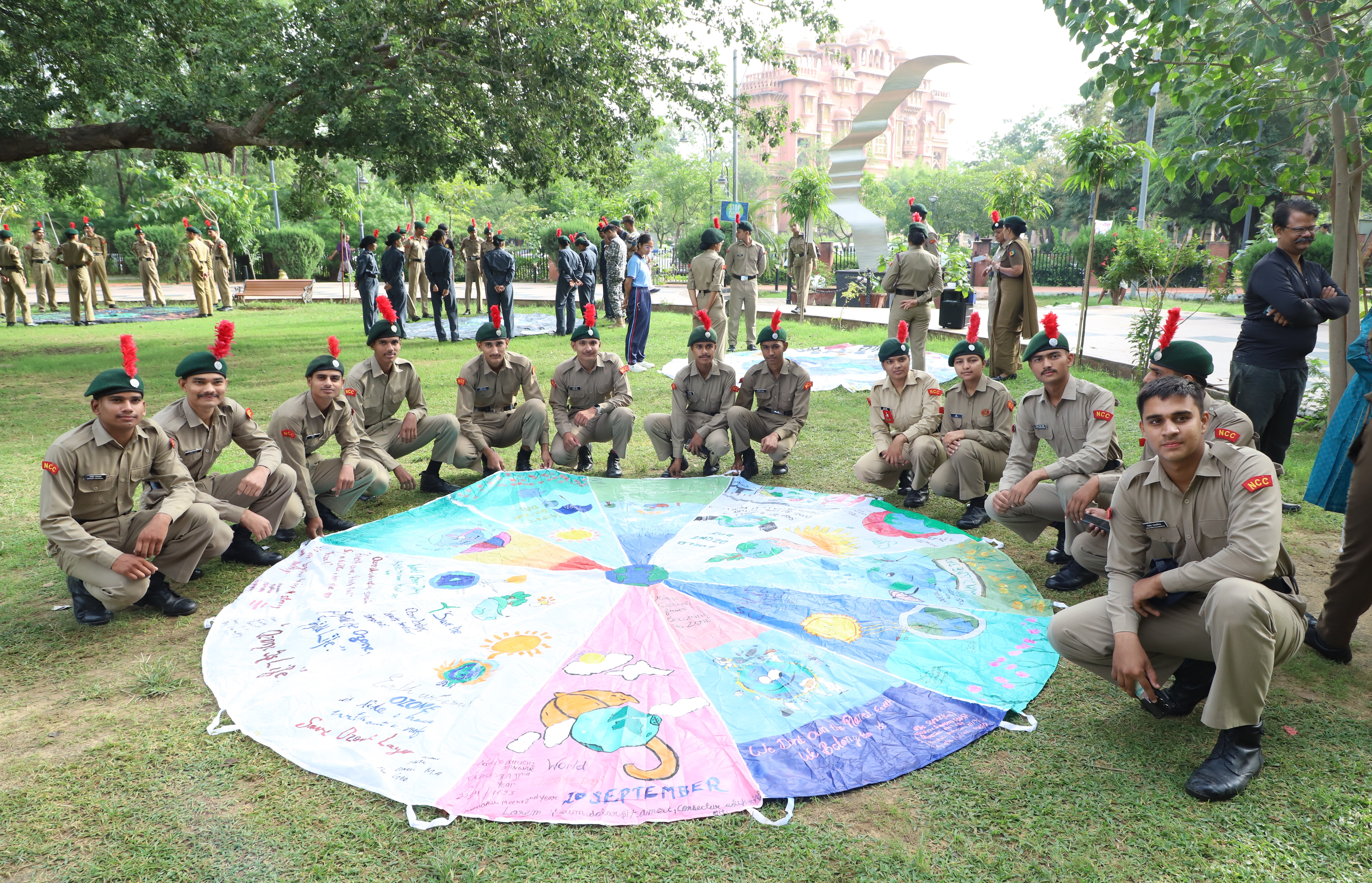 On 8th October, 2025 Mother Earth Project in association with Kanoria PG Mahila Mahavidyalaya, Jaipur organized a talk program entitled, “Declaration of Focus on the Climate Emergency”, at MEP Sculpture, Jawahar Circle. The Mother Earth Project Catalyzes Global Climate Action Through Art. As the climate crisis escalates, the world stands at a critical crossroads. To share, discuss and create awareness about Climate change and our roles and responsibilities in the fight against climate change. On the occasion present Ms. Laxmi Saxena, National Director (MEP), Ms. Sudeep Kaur Sharma (IFS), and Dr. Seema Agrawal, Principal, Kanoria PG Mahila Mahavidyalaya, Jaipur, Dr. Neelam Bageshwari, Head Department of Geography, Kanoria PG Mahila Mahavidyalaya, Jaipur, NCC Officers Shri Narendra, Sandeep Kumar, Seema Sharma, Suman Choudhary and Simpal Pareek along with 200 cadets (Army, Air force and Navy). The program emphasized the importance of Sustainable development and acknowledged the severity of climate change and commitment to take urgent systematic action. Parachutes painted by the students of Kanoria PG Mahila Mahavidyalaya, Jaipur were also displayed and cadets participated in the rally for spreading awareness. At present we must choose whether our generation will be remembered for ruining the planet or the one that saved it. Through participatory art and community engagement, MEP is building a worldwide network committed to sustainability, awareness, and policy change.