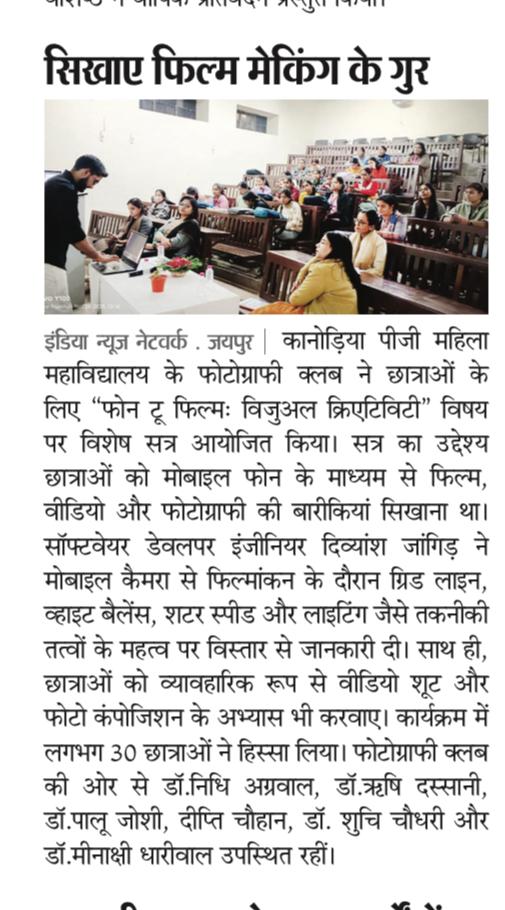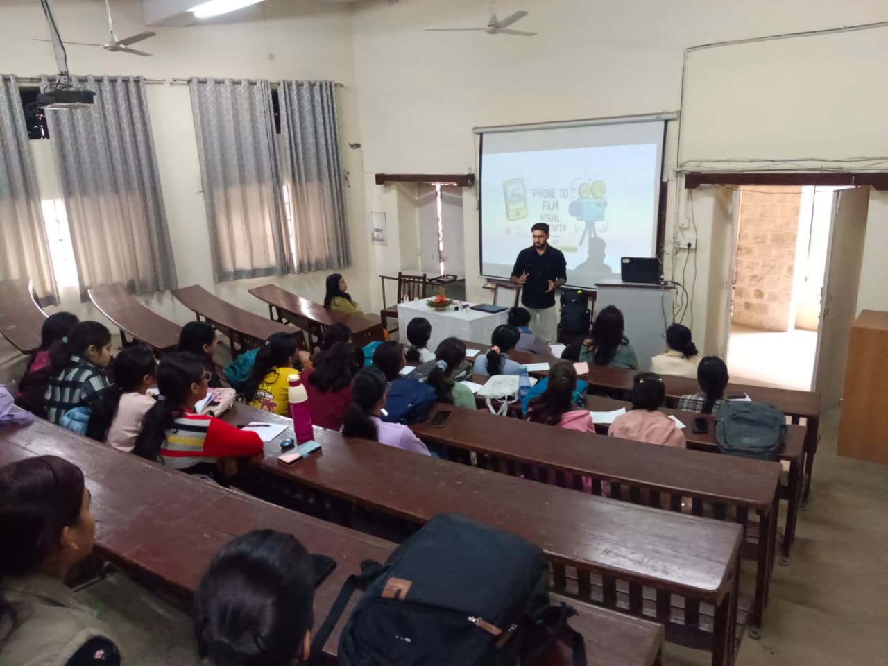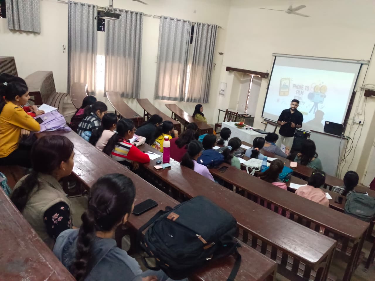 On November 29, 2025, the Photography Club of Kanoria PG Mahila Mahavidyalaya, Jaipur, hosted a boot camp titled “Phone to Film: Visual Creativity.” Divyansh Jangid, a software developer engineer at Crosscert Inc. (South Korea, Remote), served as the resource person for the same. He started by outlining the three fundamentals of filmmaking: gear, story, and skills. Next, he explained the function of fundamental camera parameters like ISO, shutter speed, and aperture in both photography and filmmaking. Additionally, Mr. Jangir showed how to use Grid Lines, Grid Points, Leading Lines, Camera Angle, and similar techniques for efficient photography and filming. He then assisted the pupils in putting these lessons into practice. Additionally, a film that he shot entirely on his cell phone was shown. The session was attended by around thirty students as well as Drs. Nidhi Gupta, Rishi Dassani, Palu Joshi, Dipti Chauhan, Shuchi Chowdhary, and Minakshi Dhariwal.