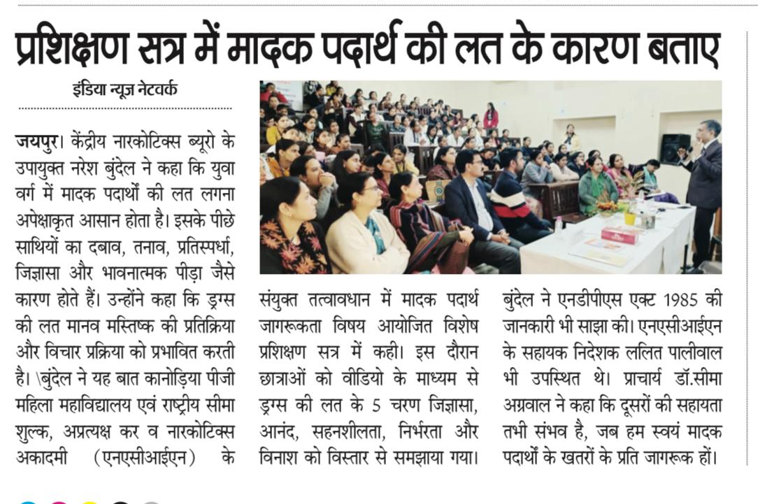 कानोड़िया पीजी महिला महाविद्यालय, जयपुर के आंतरिक गुणवत्ता मूल्यांकन प्रकोष्ठ एवं राष्ट्रीय सीमा शुल्क, अप्रत्यक्ष कर और नारकोटिक्स अकादमी (एनएसीआईएन), के संयुक्त तत्वावधान में दिनांक 20 जनवरी 2026 को छात्राओं के लिए मादक पदार्थ जागरूकता विषय पर एक प्रशिक्षण सत्र का आयोजन किया गया। महाविद्यालय प्राचार्य डॉ. सीमा अग्रवाल ने स्वागत वक्तव्य में स्वजागृति को महत्वपूर्ण बताया। उन्होंने कहा कि दूसरों की सहायता हम तभी कर सकते हैं जब हम स्वयं मादक पदार्थों के खतरों के प्रति जागरूक हो। सत्र में प्रशिक्षक के रूप में नरेश बुंदेल, उपायुक्त, सी. बी. एन, तथा ललित पालीवाल, सहायक निदेशक, (एनएसीआईएन),उपस्थित थे। नरेश बुंदेल ने कहा कि युवा वर्ग के लिए मादक पदार्थों की लत लगना बहुत आसान होता है। इसके पीछे कई कारण होते हैं, जैसे साथियों का दबाव, तनाव, प्रतियोगिता, जिज्ञासा तथा भावनात्मक पीड़ा आदि। उन्होंने यह भी बताया कि ड्रग्स की लत मानव मस्तिष्क के प्रतिक्रिया और विचार के अंतराल में पड़ जाती है। उन्होंने लघु वीडियो फिल्म के द्वारा बताया कि ड्रग्स की लत के पांच पड़ाव होते हैं- जिज्ञासा, आनंद, सहनशीलता, निर्भरता और विनाश। नरेश बुंदेल ने ड्रग्स की रोकथाम को एकमात्र उपाय बताते हुए, सही साथ, तनाव प्रबंधन के स्वास्थ्य तरीकों को अपनाना, दबाव और सोशल मीडिया के प्रभाव से दूर रहना और ड्रग्स को दृढ़ता से न कहने पर बल दिया। उन्होंने प्राकृतिक एवं अप्राकृतिक ड्रग्स में भेद बताते हुए कहा कि दोनों प्रकार के मादक पदार्थ हानिकारक होते हैं, किन्तु कुछ प्राकृतिक ड्रग्स का औषधीय प्रयोग भी होता है। उन्होंने एन डी पी टी एस एक्ट, 1985 के विषय में भी बताया। सत्र के अंत सभी को मादक पदार्थों से दूर रहने के लिए शपथ दिलाई गई।