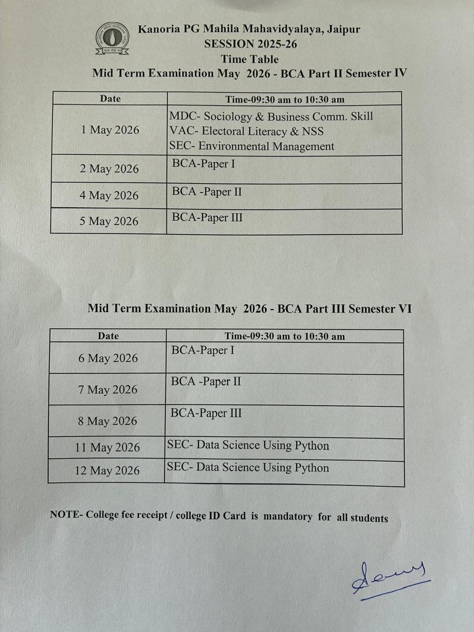 BCA Mid Term Examination Timetable PrevPreviousMid Term Examination May 2026 UG Part-II, Semester-IV and arts Part III Sem VI